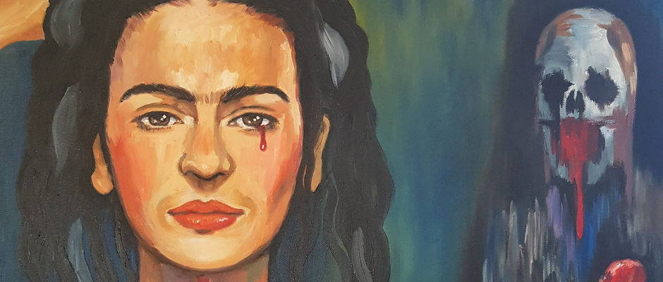 -"Aun no Pelona, aun no" (Not yet Death, not yet) shows Frida getting ready for a common day with her prosthetic leg waiting, and natural flowers for her hair. Her spinal column throbbing in pain and very present. La Pelona, with one of her unborn dead babies in hand appears as to remind her that her time is near. The butterfly is a symbol: it is weak and dying and at the same time, still flying low and flapping its wings. Frida tells Death that she is not ready yet to join her. She sheds a tear in pain but what keeps her alive is her love for art as her heart is attached to the paint pallete. Frida often painted herself with her heart outside her body and I was inspired by a painting she made of her broken column. I hope she is proud.